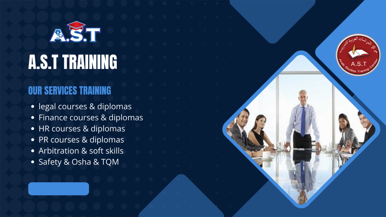 مركز الدراسات العربية للتدريب والتنمية البشرية (A.S.T) هو مركز خاص مستقل تم تأسيسه بسجل تجاري رقم 227389 وبطاقة ضريبية رقم 216- 462- 418 لتنفيذ وإعداد جميع البرامج التدريبية بمختلف التخصصات، المركز معتمد من الجهاز المركز للتنظيم والادارة – برئاسة مجلس الوزراء .